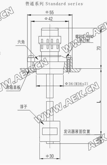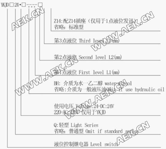 <1>用单点液位控制继电器控制液位:油箱盖板b到所需的液位发讯位置a的距离,长度为800mm时,订货型号为YKJD24-800。