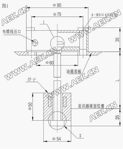 安装简单等特点。图1是该装置的剖面图及安装尺寸,工作时浮了随液面升高或