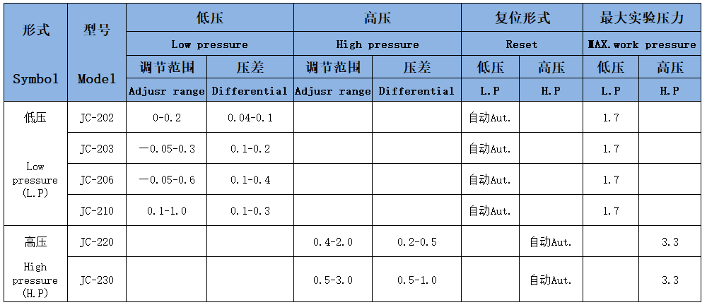 JC-202,JC-203,JC-206,JC-210,JC-220,JC-230压力控制器