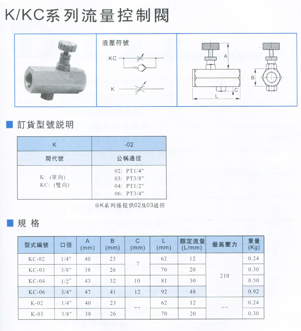 KC单向节流阀,KC-02,KC-03,KC-04,KC-06,KC-08