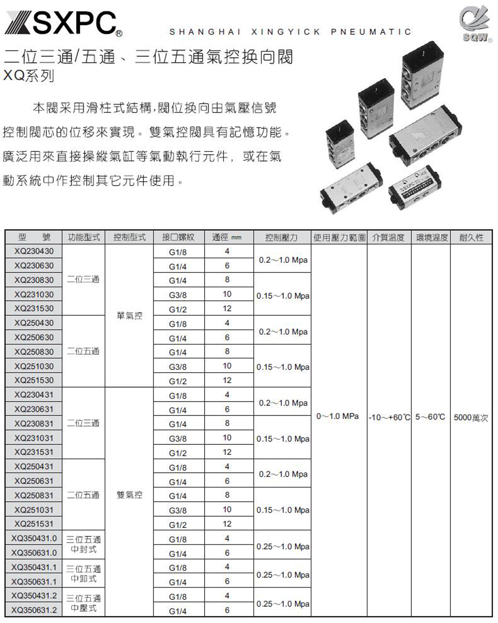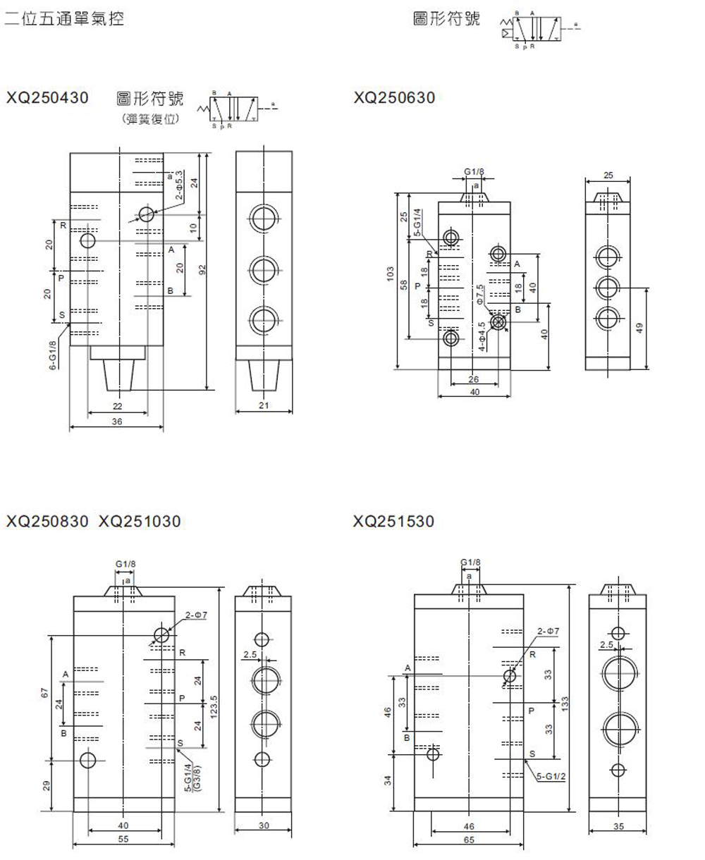 二位五通气控阀,XQ250430,XQ250630,XQ250830,XQ251030,XQ251530 XQ二位五通单气控阀,