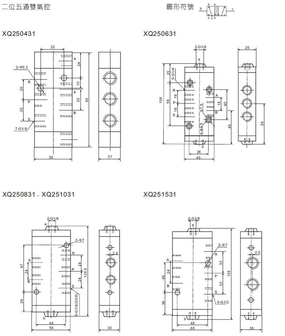 二位五通双气控阀XQ250431,XQ250631,XQ250831,XQ251031,XQ251