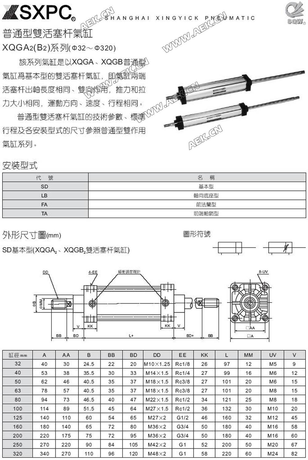 XQGB2双活塞杆双作用气缸,XQGA2双活塞杆气缸XQGB2-100