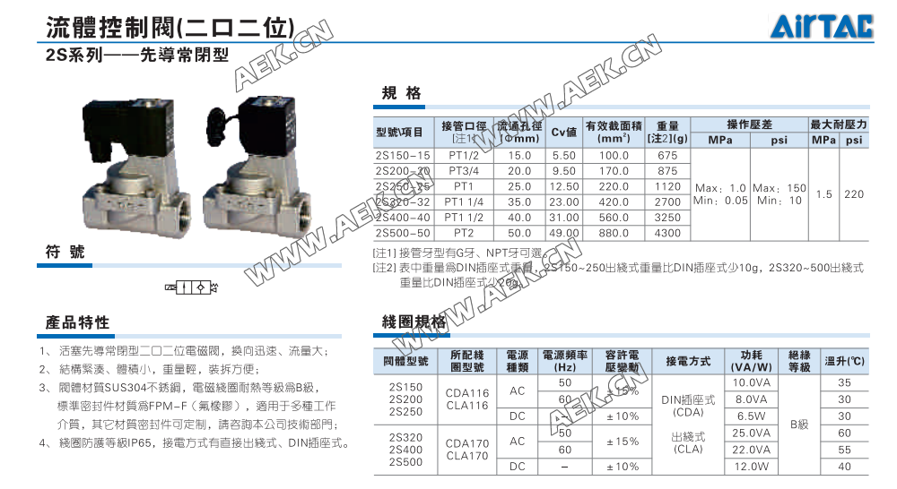 AirTAC亚德客2S系列电磁阀2S150,2S200,2S250,2S320,2S400,2S500先导式电磁阀