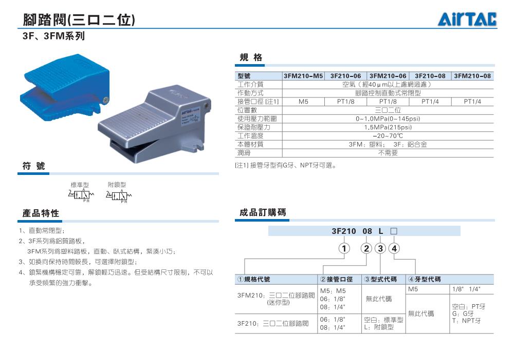 AirTAC亚德客脚踏阀3F210-06,3F210-08,3FM210-M5,3FM210-06,3FM210-08,3F210-06L,3F210-08L