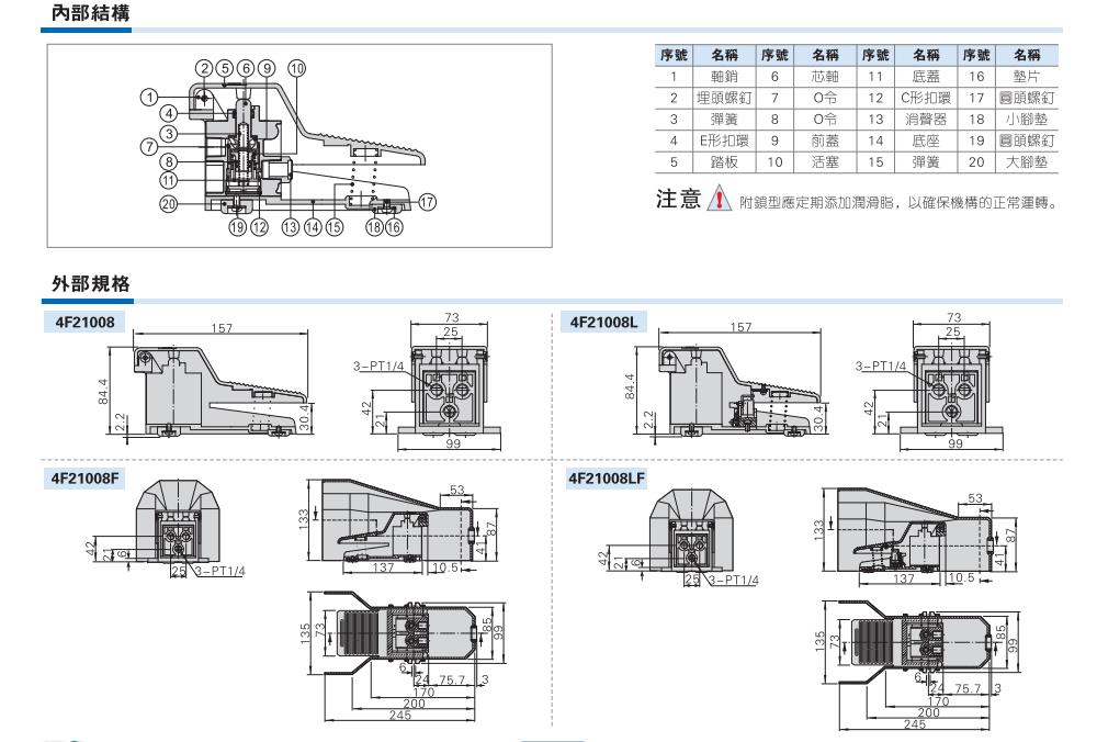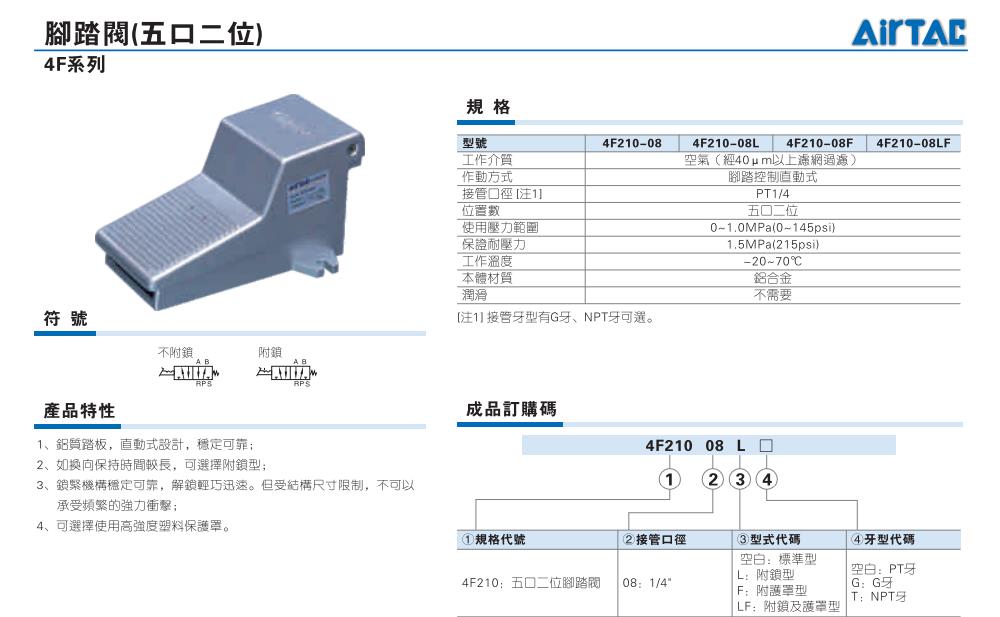 AirTAC亚德客 4F系列脚踏阀 4F210-08、4F210-08L、4F210-08F、4F210-08LF