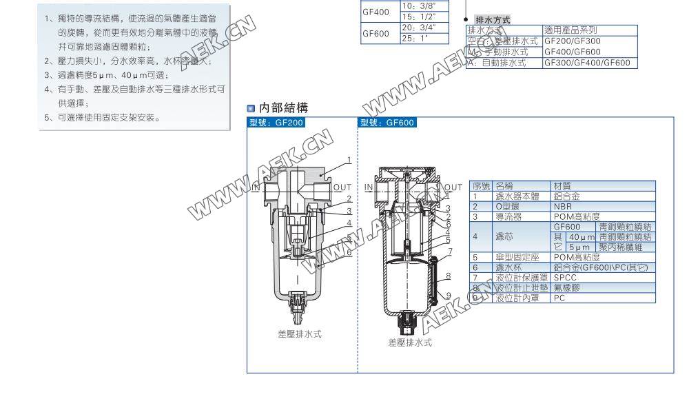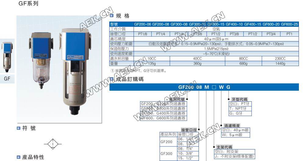 AirTAC亚德客 气源处理件 GF200、GF300、GF400、GF600过滤器