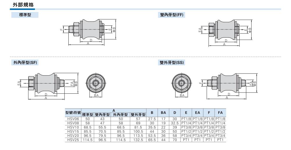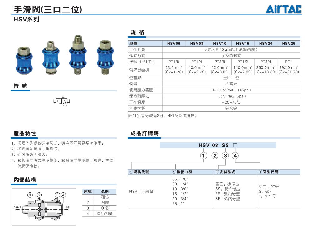 AirTAC亚德客 双内牙型 HSV06-FF、HSV08-FF、HSV10-FF、HSV15-FF、HSV20-FF、HSV25-FF手动滑阀