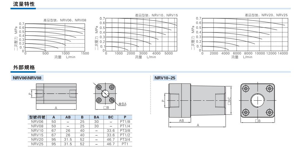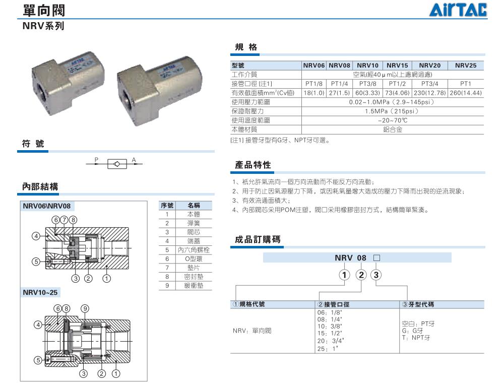 AirTAC亚德客 单向阀 NRV06、NRV08、NRV10、NRV15、NRV20、NRV25