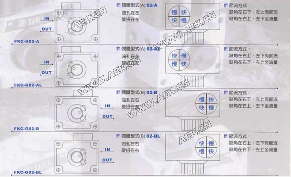 | 单向调速阀 FKC:推杆型 FNC:平面型 | G:板式 | 02: 1/4" 03: 3/8" | 2: 0.05-2 3: 0.05-4 | 从调节旋钮看 02:A 左侧(标准) B 右侧 03:A 右侧(标准) B 左侧 | 无标记:正向 L:逆向 |